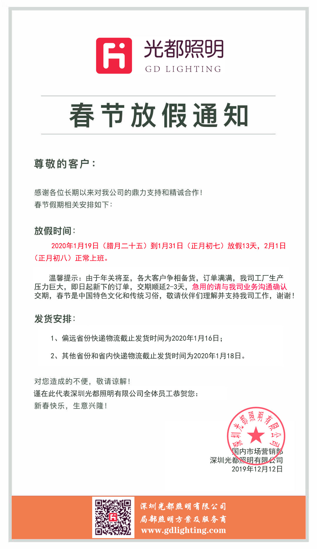 光都照明2020年春节放假通知
